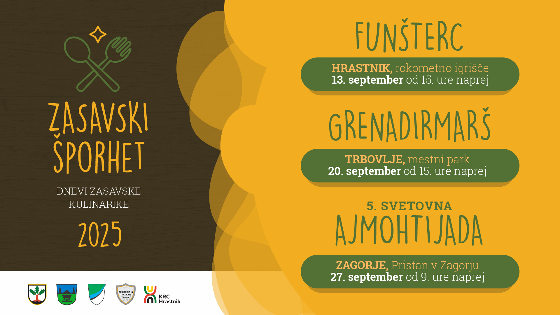 5. svetovno ajmohtijado v Zagorju (27. september od 9. ure dalje v Pristanu) in dneve zasavske kulinarike pri gostinskih ponudnikih v vseh treh mestih.