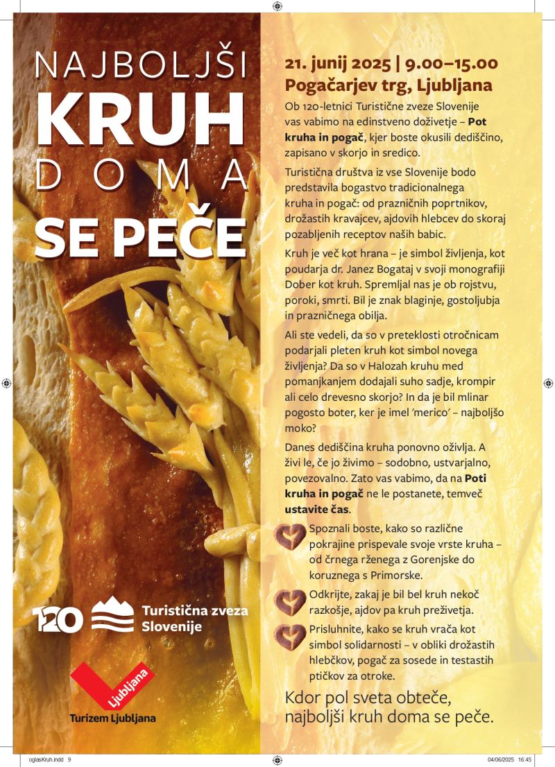 Po zaključku akademije vas vabimo na Pogačarjev trg, kjer bo med 9.00 in 15.00 uro potekala »Pot kruha in pogač« – praznično druženje s pokušino tradicionalnih kruhov in pogač, ki jih bodo predstavila turistična društva iz vseh koncev Slovenije.