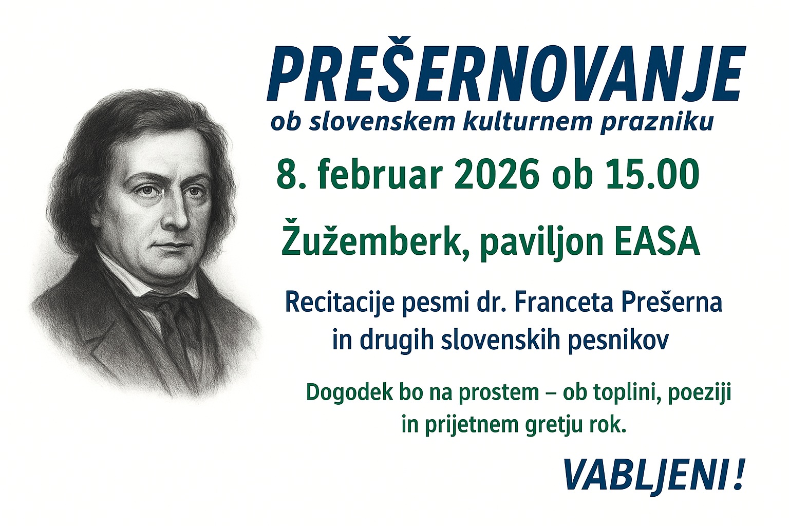 Turistično društvo Suha krajina vabi na že 14. tradicionalno Prešernovanje, s katerim bomo ob slovenskem kulturnem prazniku počastili življenje in delo našega največjega pesnika, dr. Franceta Prešerna. Prešernovanje bo pod pavilionom EASA v centru Žužemberka ob 15.00 uri. Pesmi bodo recitirali domači ustvarjalci, svoje verze pa bodo predstavili tudi domači in gostujoči pesniki,