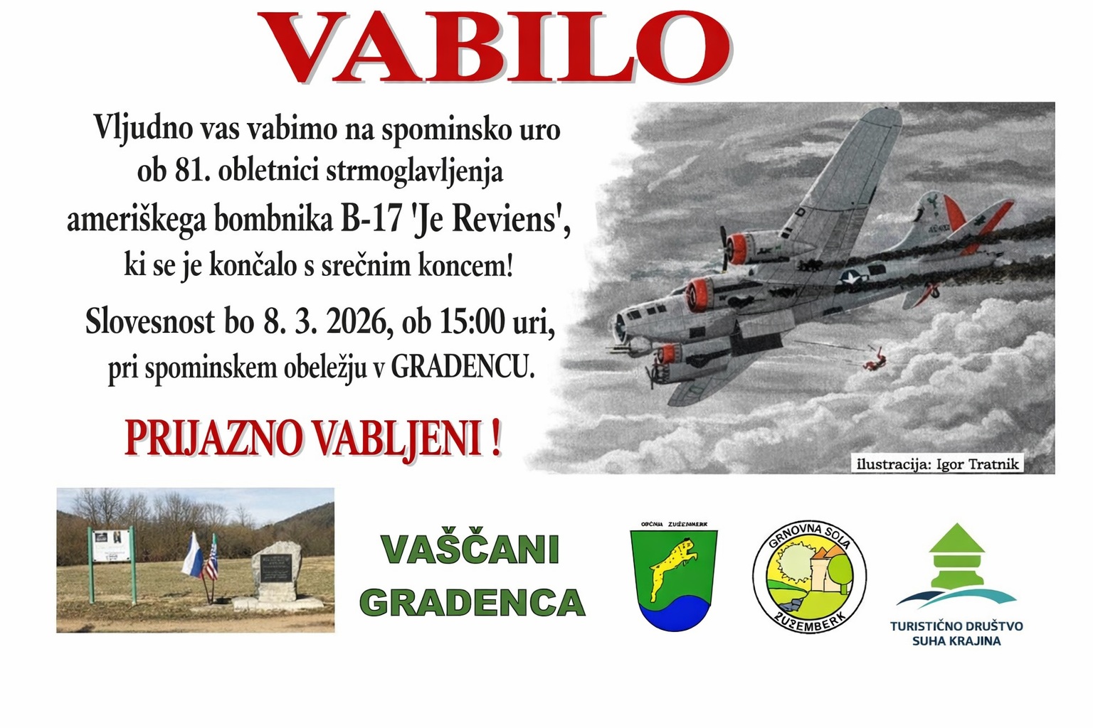 Vabimo vas na obletnico strmoglavljenja bombnika B-17, ki bo v nedeljo, 8. 3. 2026, ob 15.00 uri pri spominskem obeležju v Gradencu