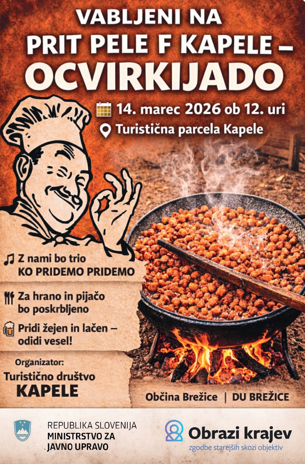 Prvi dogodek v okviru projekta bo potekal v soboto, 14. marca 2026 ob 12. uri, v Kapelah, kjer Turistično društvo Kapele v sodelovanju z Društvom upokojencev Brežice pripravlja dišečo in družabno prireditev Ocvirkijada.