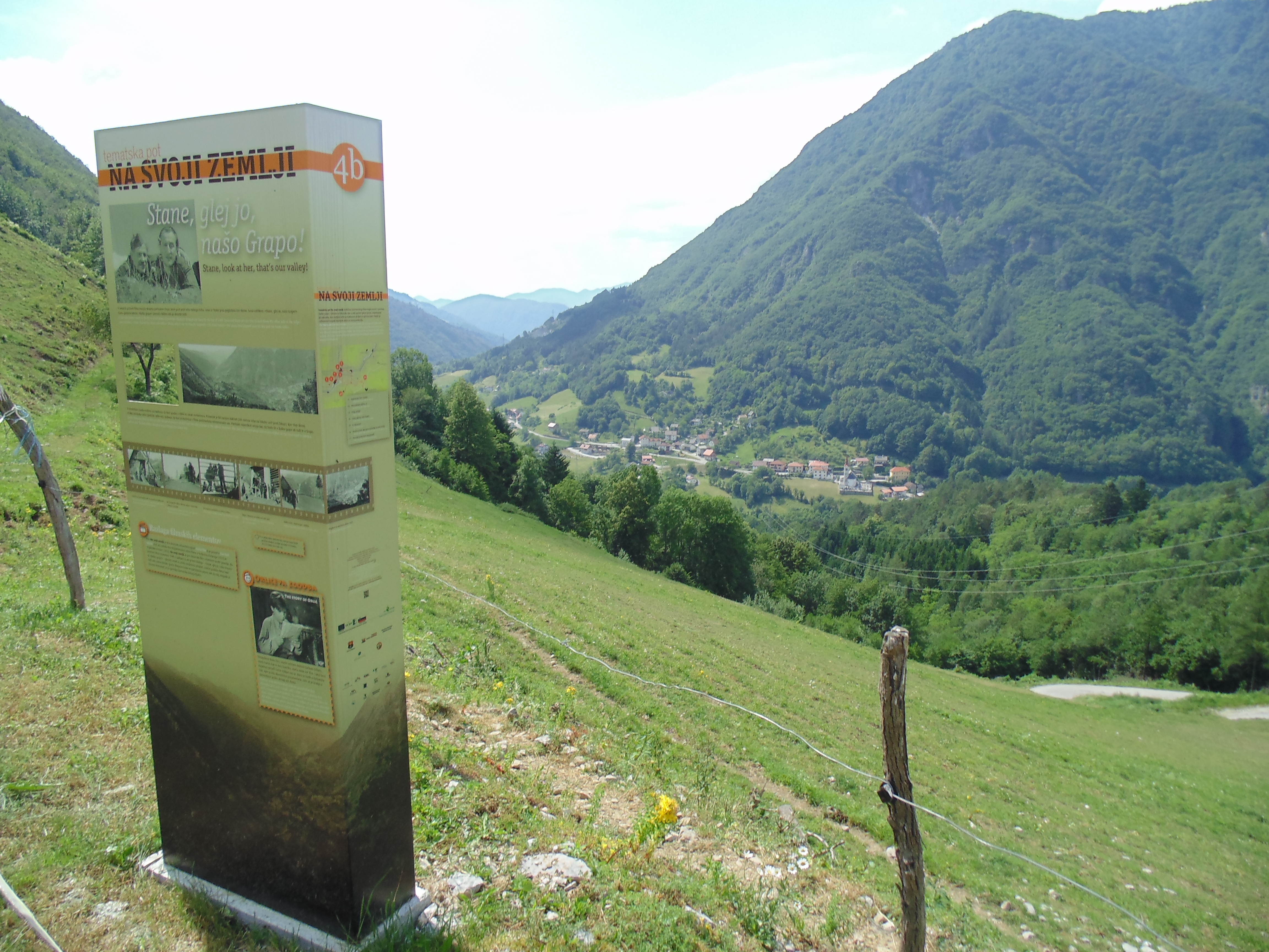 Program: 9.00 – 10 ure registracija pohodnikov 10.00 – kratka predstavitev TpNSZ in uvodni pozdravi (kratki odlomki iz filma, ogled tematske sobe, itd. ). 10.20 – pričetek pohoda od 1 – 6 tematske table, vključen kulturni program 15.00 – zaključek pohoda, pogostitev, druženje. Gost: iz igralsko-filmskega sveta Pohodnik je nagrajen s čudovitimi razgledi, ki jih nudi razgibano območje poti med Grahovem ob Bači in Koritnico. Vsebina pohoda je obogatena z dodatnimi kulturnimi točkami, ki kažejo na lokalno zgodovino območja. Lokalni turistični vodniki nam bodo predstavili zgodbe: kulturne dediščine (Ivan Kokošar – duhovnik in skladatelj, slikarka s peski Stanka Golob , zgodba leta 1908 na Grahovem ob Bači ustanovljenega prvega čebelarskega društva za Cerkljansko, Goriško in Tolminsko), filmske dediščine (Rudi Bašelj – Edini izhod, dokumentarni film - Plamen v dvonožcu, tematske table na poti), tehniške dediščine (pilot Jože Lapanja, Bohinjska proga, pionirji zmajarstva na Tolminskem); Branje odlomkov med pohodom iz del: France Štiglic, Zapiski o ustvarjanju filma »Na svoji zemlji«; Ciril Kosmač, novela Očka Orel, podlaga za film Na svoji zemlji; 40 let postavitve spomenika filmu Na svoji zemlji V okviru programa Dnevov evropske kulturne dediščine - tema: Zidovi naše preteklosti, temelji naše prihodnosti: rimski zid v Zarakovcu, stara cerkev, cerkev sv. Ane, NOB - spominska plošča talcem na Grahovem ob Bači, spomenik padlim NOB na Koritnici (1972), Letos pa je sestavni del kulturnega projekta S KORAKI PODČRTANE ZGODBE, ki ga financira Občina Tolmin. Spremljevalni program: foto razstava o obnovi spomenika filma Na svoji zemlji Celoten pohod spremlja harmonikaš.