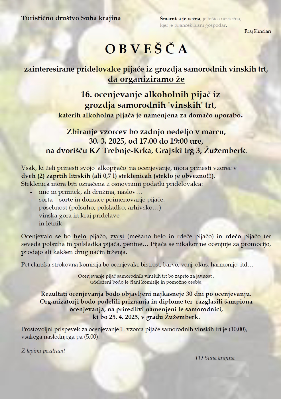 TD Suha krajina obvešča, da organizira že 16. ocenjevanje pijač iz grozdja samorodnih vinskih trt,ki bo 30. marca 2025, od 17. do 19: ure na dvorišču KZ Trebnje-Krka v Žužemberku, Grajski trg 3.