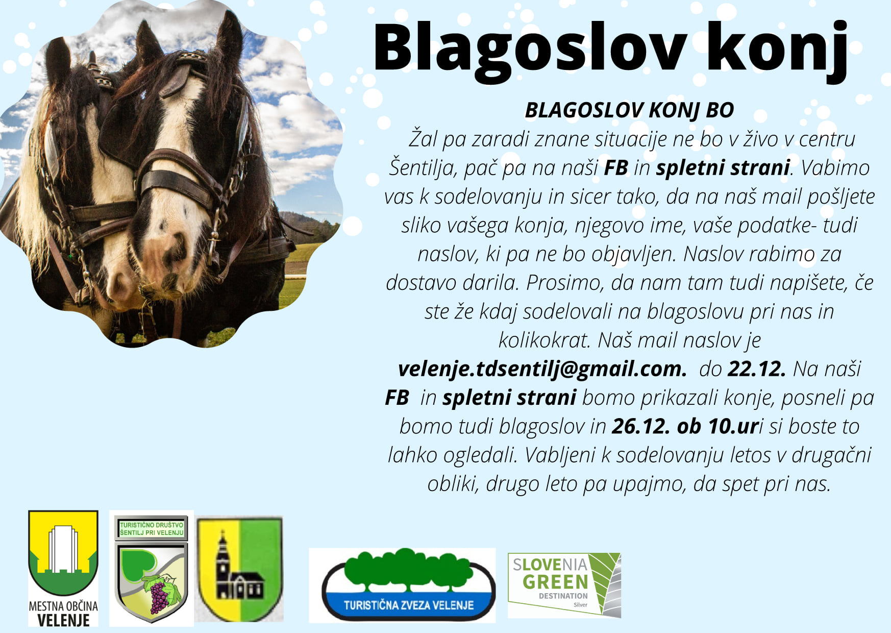 TRUDIMO SE , DA OHRANJAMO TRADICIJO ZATO KLJUB COVIDU BOMO SPELJALI BLAGOSLOV .ZATO VAS VABIMO, DA LAHKO SODELUJETE Z SVOJIMI KONJI.