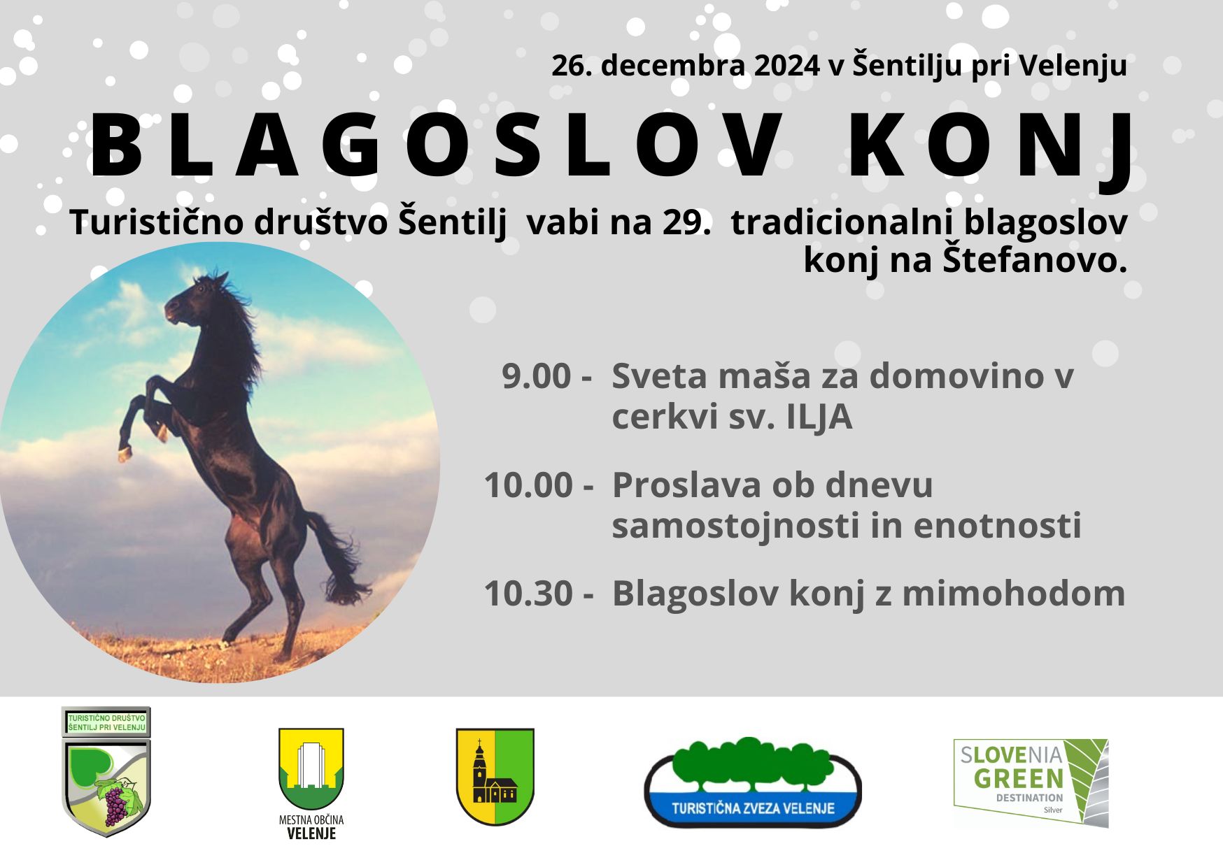 Prireditev poteka ob prazniku Dan samostojnosti in enotnosti zato v program vključimo tudi proslavo ob tem prazniku. Sam blagoslov poteka tako, da lastniki konj svoje živali vodijo mimo domačega župnika, ki blagoslov tudi opravi. Prireditve se veselijo tako lastniki konj kot tudi ljubitelji živali in narave. Srečajo se znanci, poklepetajo in si zaželijo srečo v prihajajočem letu. Seveda poskrbimo, da je vzdušje prijetno tako za oko kot za ostale čute.