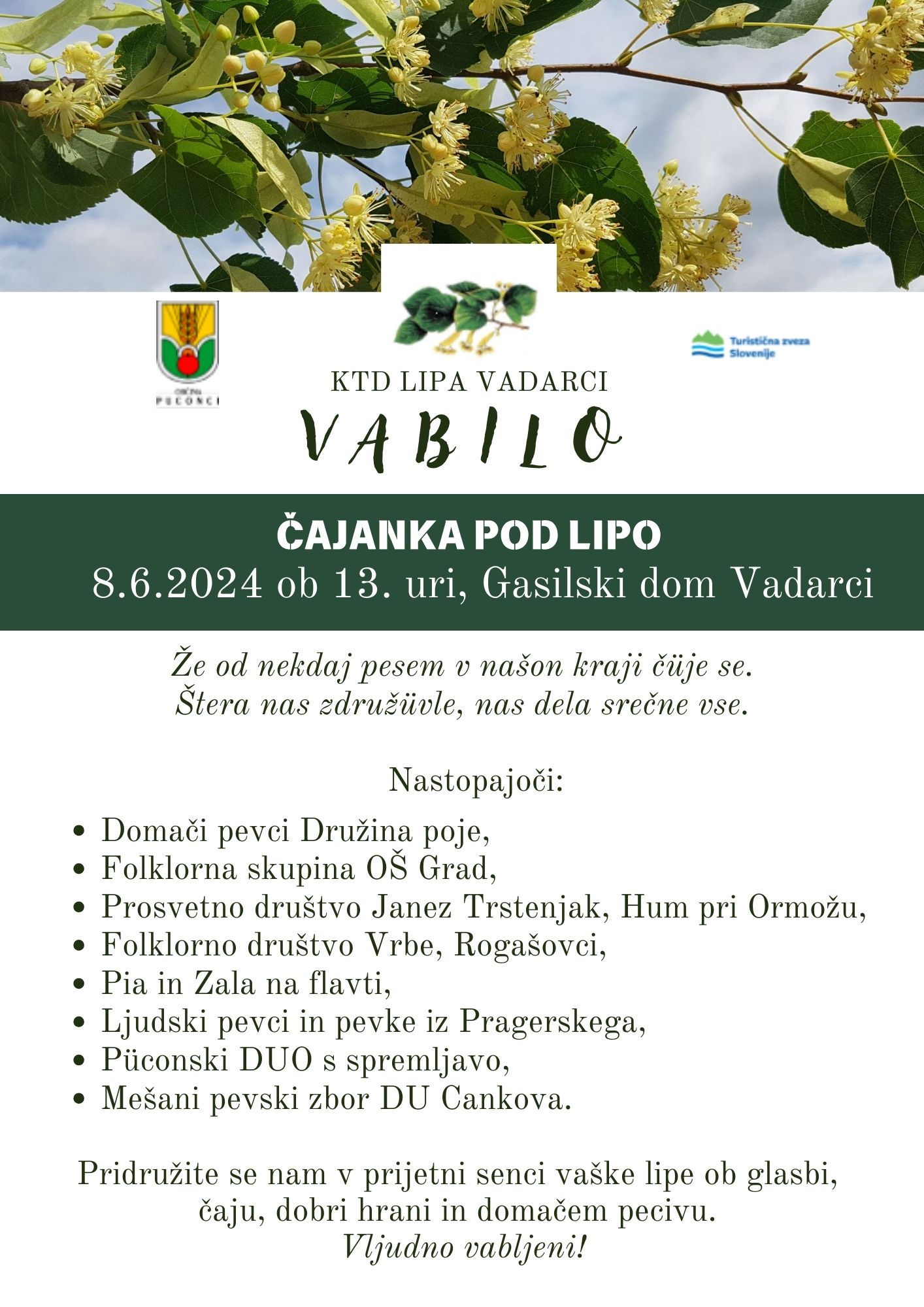 Pridružite se nam v prijetni senci vaške lipe ob glasbi, čaju, dobri hrani in domačem pecivu. Vljudno vabljeni!