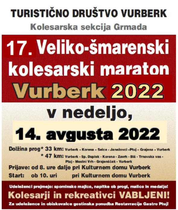 Tradicionalni rekreativni kolesarski maraton na dveh progah, 33 in 47 km, TD Vurberk 2022