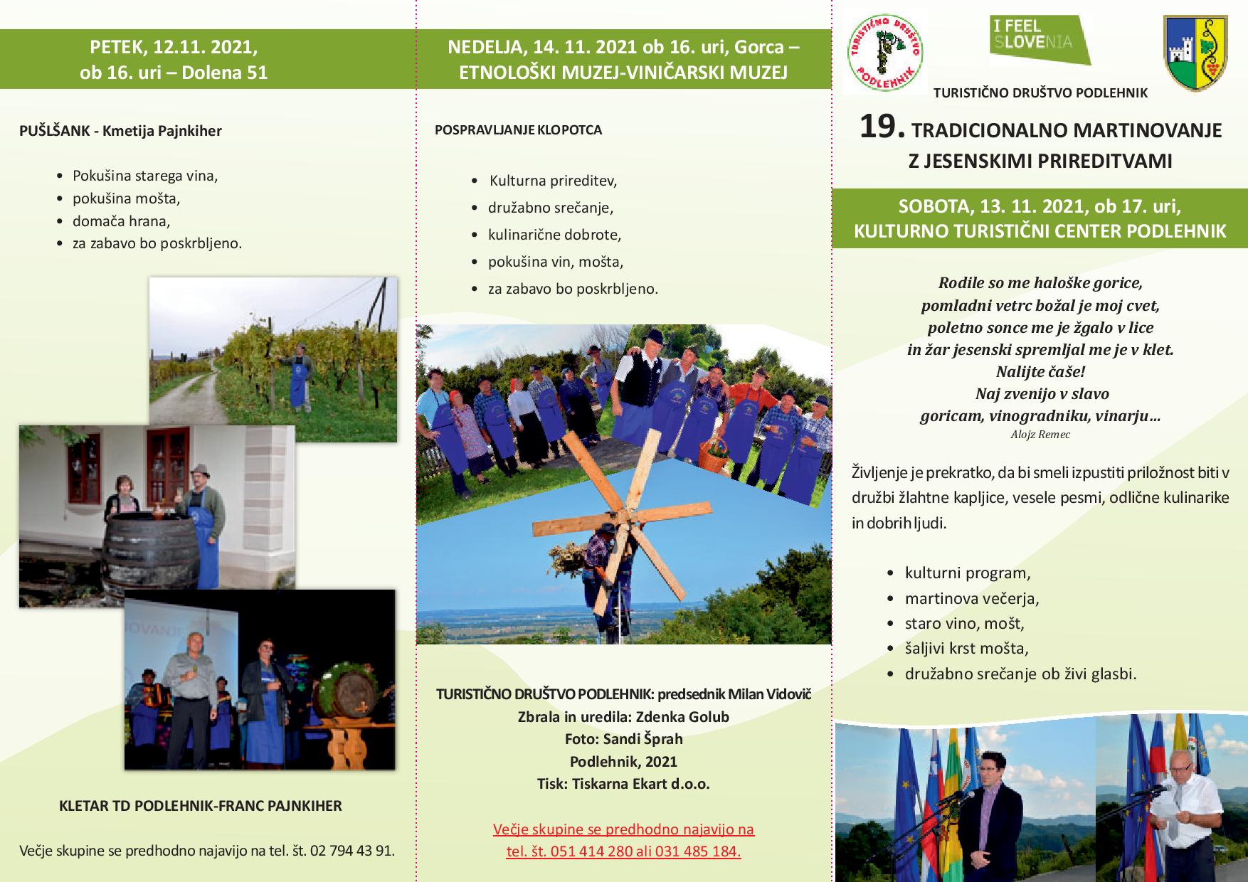 Vabljeni na MARTINOVANJE Z JESENSKIMI PRIREDITVAMI, z osrednjim dogodkom v soboto, 13.11.2021, ob 17. uri v kulturno turističnem centru Podlehnik.