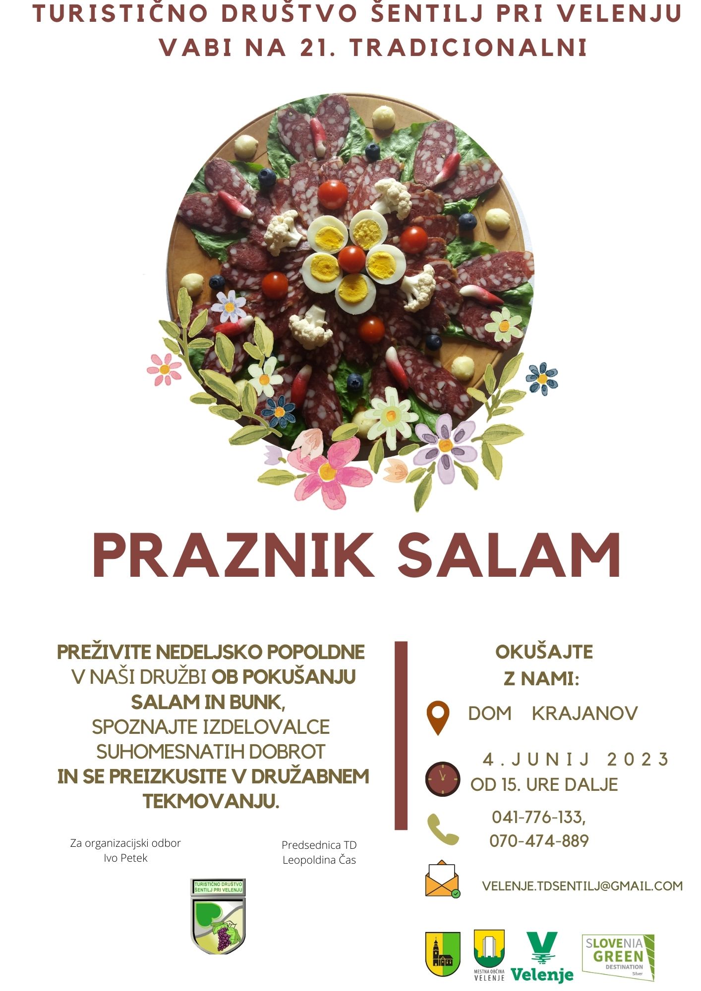 21. Tradicionalni Praznik salam bo 4.6.2023 ob 15. uri v Domu krajanov v Šentilju pri Velenju. Pridite in preživite nedeljsko popoldne v naši družbi ob pokušanju salam in bunk. Spoznajte izdelovalce suhomesnatih dobrot in se preizkusite v družabnem tekmovanju. Zraven še bo tudi razglasitev rezultatov ocenjenih izdelkov.
