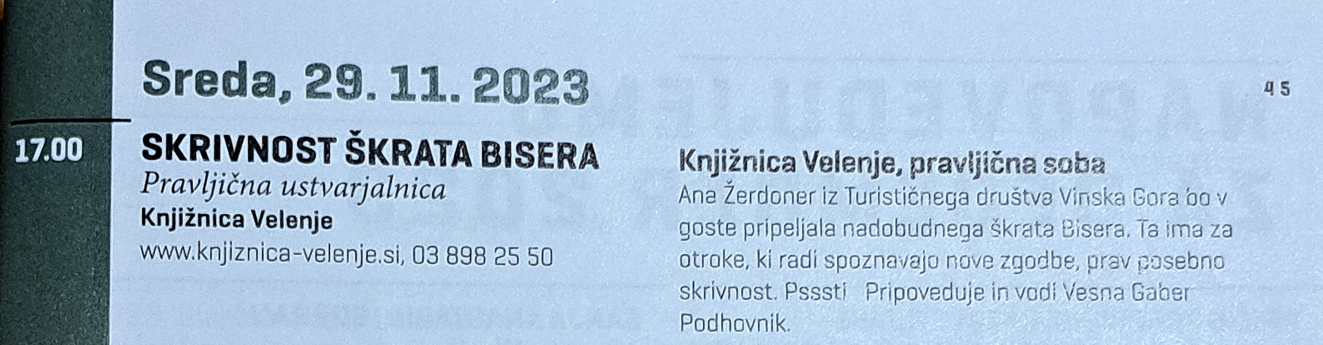 S kolegico Vesno bova otrokom predstavili Skrivnost škrata Bisera, da jih bo zamikalo, da spoznajo kako je dogodivščina možna v živo. Sledila bo delavnica, v kateri si bomo naredili čepice z biserom, da bomo vsi prisotni postali podobni škratu Biseru, ki je dobrosrčen in ima rad živali.