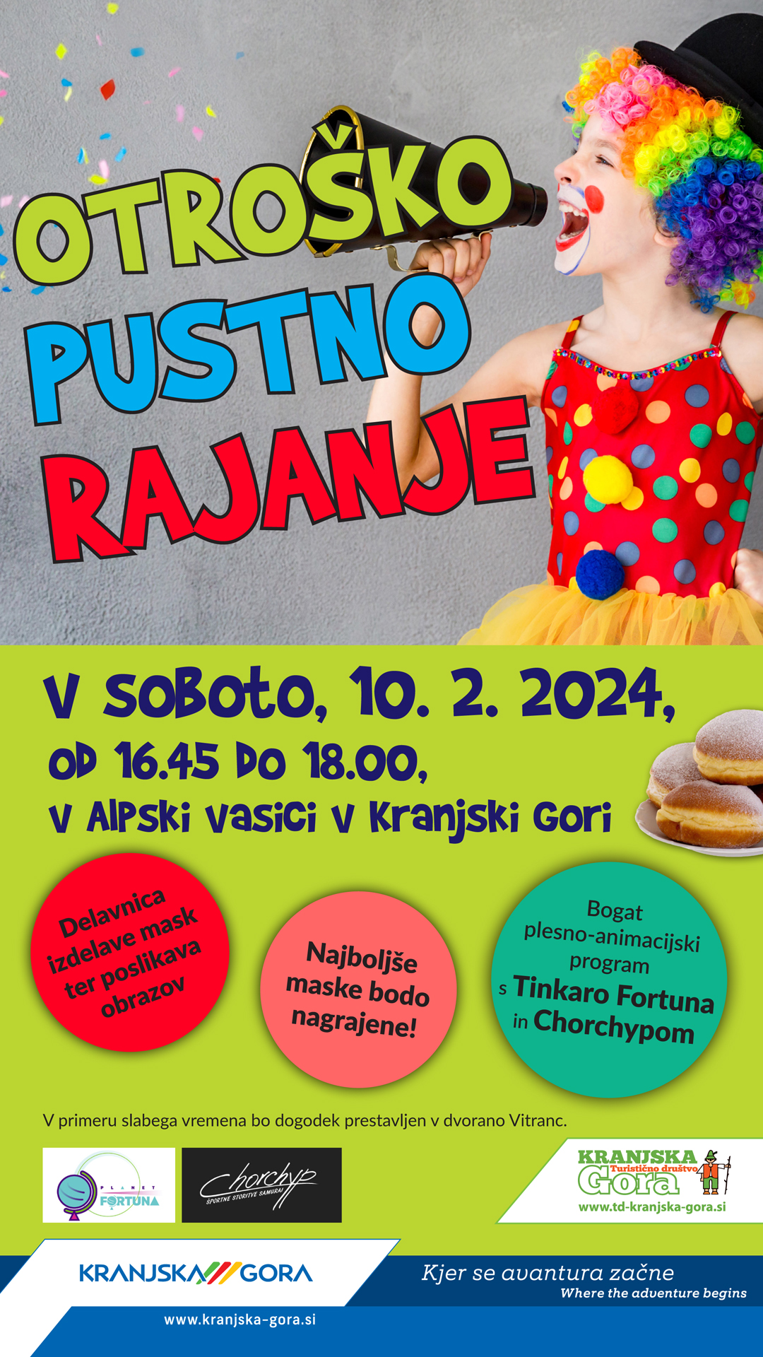 Bogat plesno animacijski program bosta povezovala Tinkara Fortuna in Chorchyp, obogaten pa bo z delavnico izdelave mask ter poslikavo obrazov.