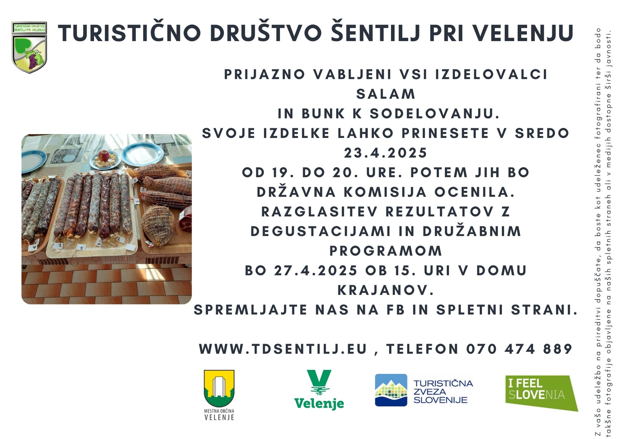 Za ocenitev vaših izdelkov se javite na naš naslov društva. Salame in bunke zbiramo v sredo 23.4. od 17. ure do 19h v dom krajanov v Šentilju pri Veleju.