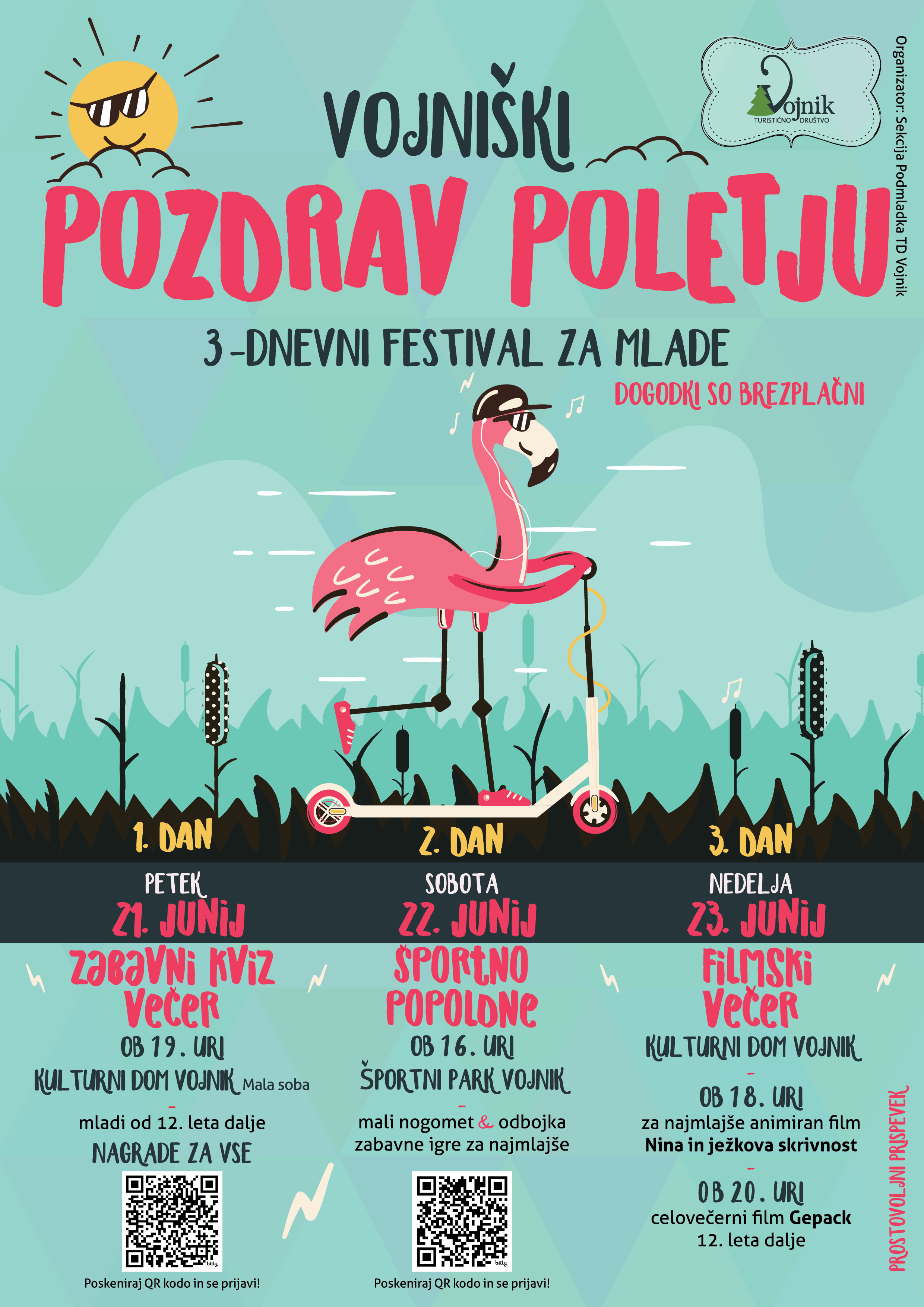 Tridnevni festival za mlade je razdeljen razdeljen na 3 dni: 1. DAN 21.6.2024 z pričetkom ob 19.uri 2. DAN 22.6.2024 s pričetkom ob 16.uri 3. DAN 23.6.2024 s pričetkom ob 18.uri