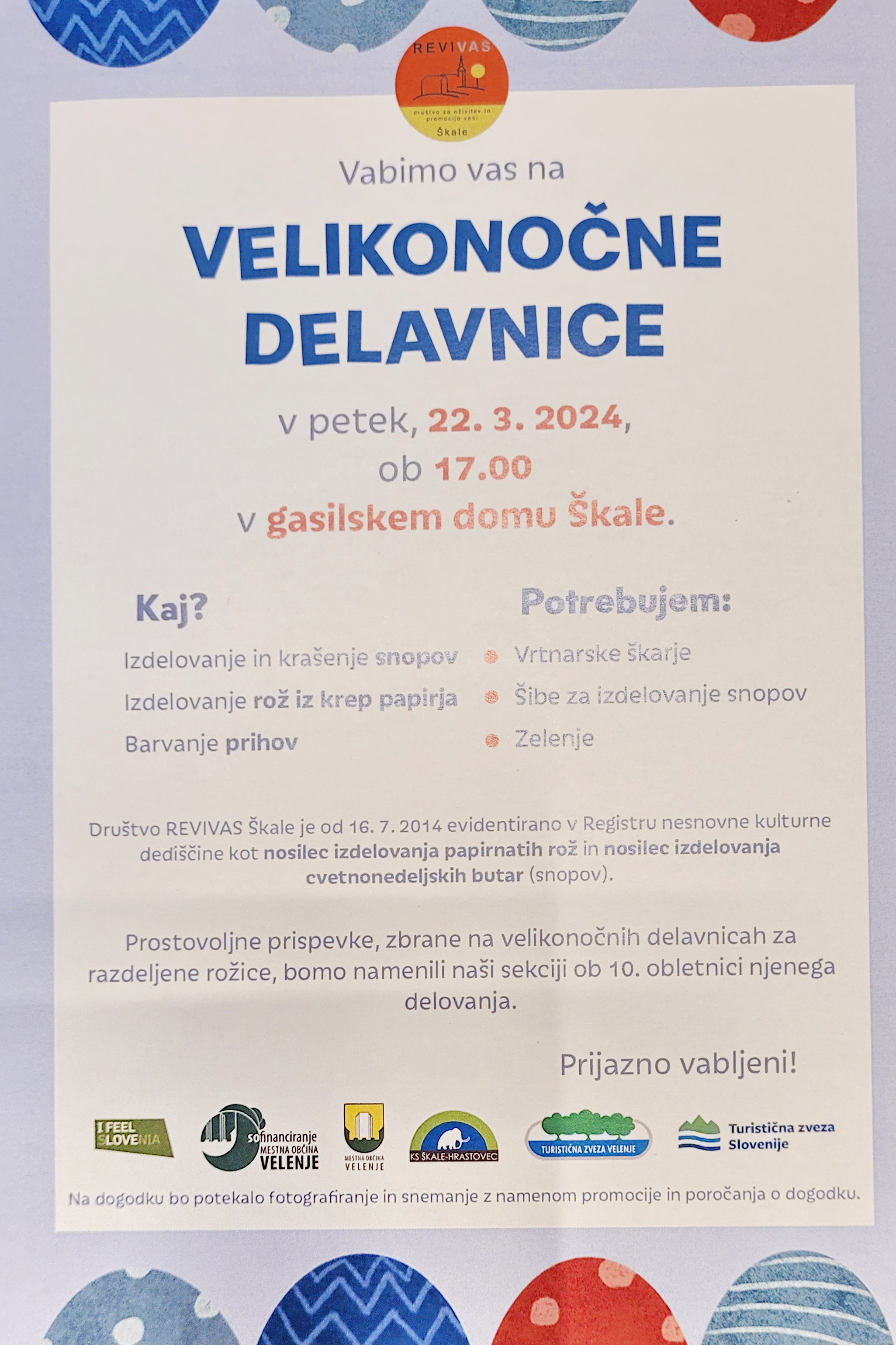 V petek 22. 3. 2023 ob 17. uri v gasilskem domu Škale izdelovanje snopov, izdelovanje rož iz krep papirja in barvanje pirhov. S sabo prinesite vrtnarske škarje, šibe za izdelovanje snopov in zelenje.