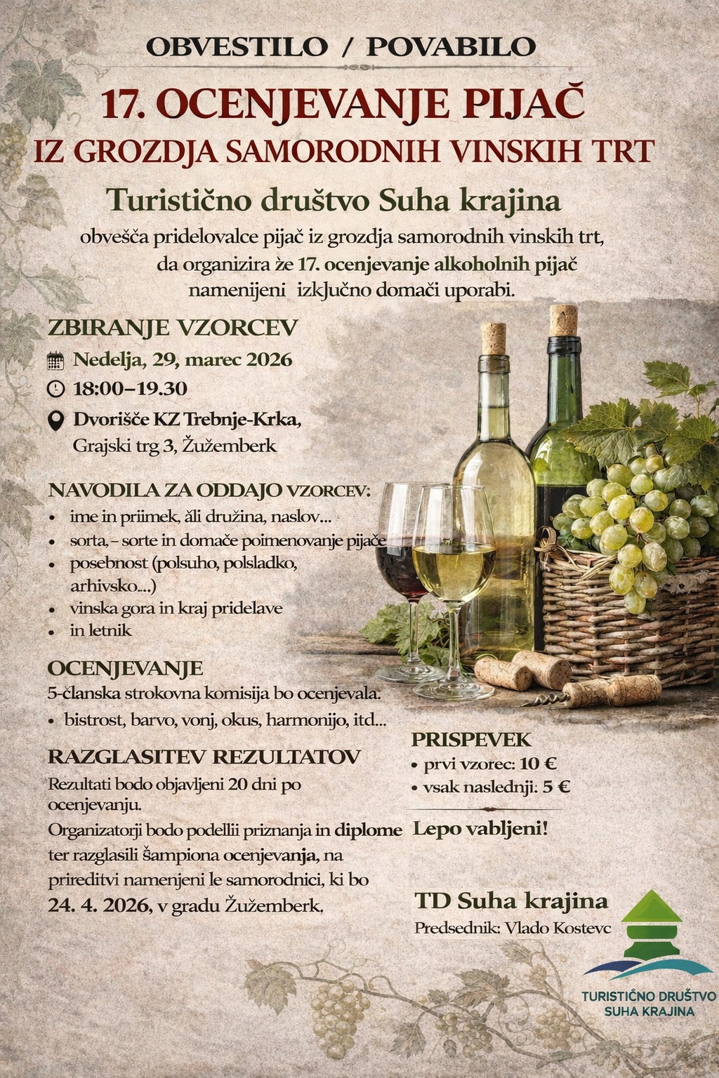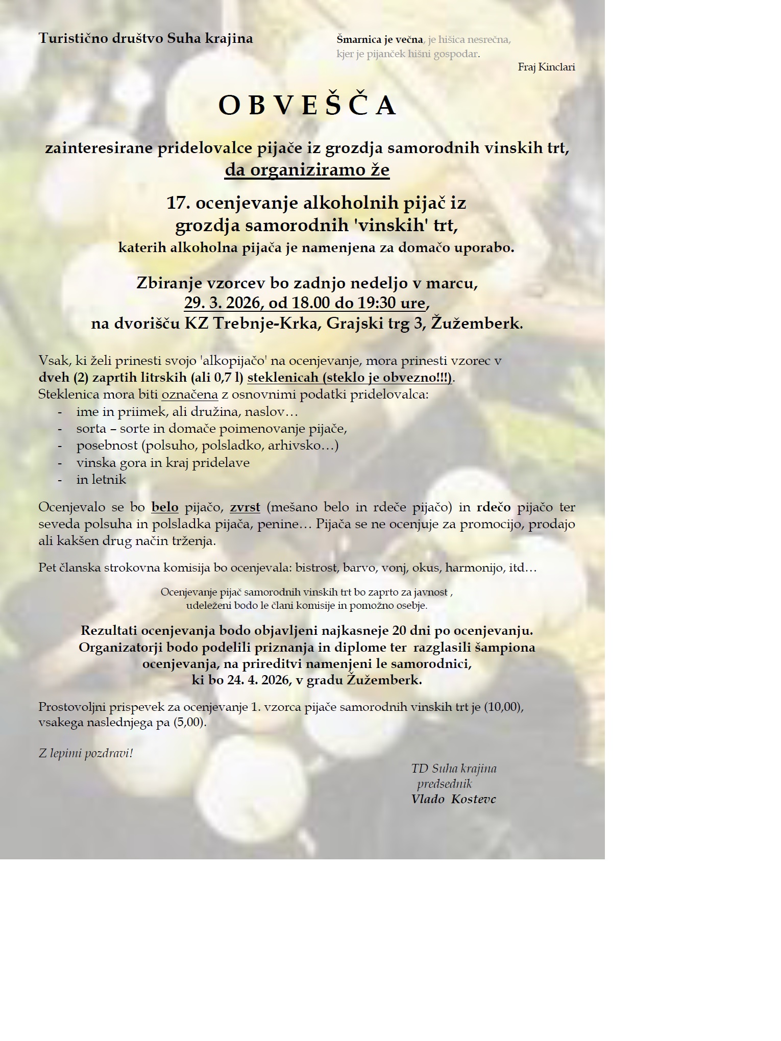obveščamo vse pridelovalce pijač iz grozdja samorodnih vinskih trt, da organizirmoa že 17. ocenjevanje alkoholnih pijač. Zbiranje vzorcev bo 29. 3. 2026, od 18:00 ure naprej V Žužemberku Grajski trg 3, na dvorišču KZ.
