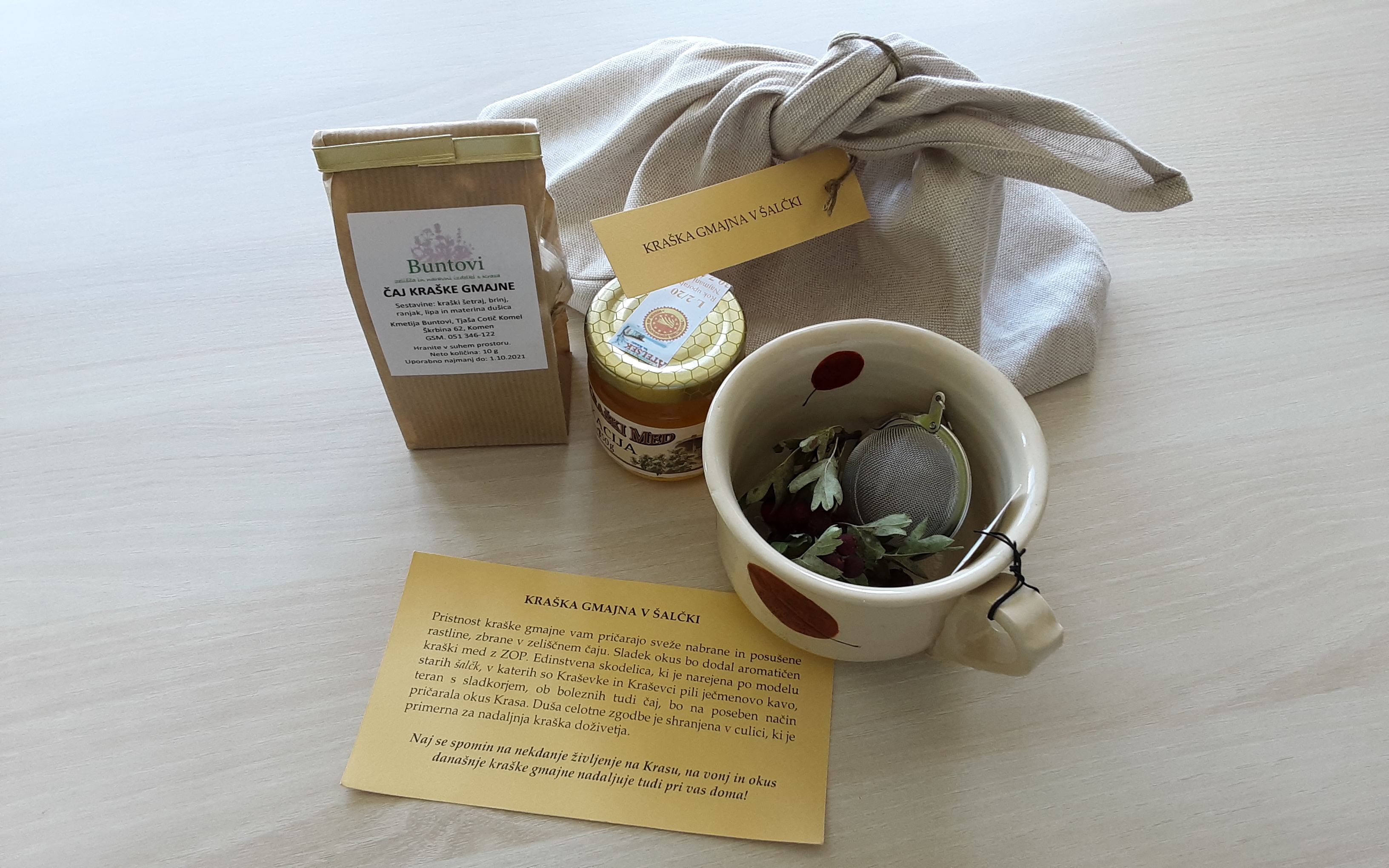 Za vsako skupino je strokovna komisija izbrala po tri izdelke in jim podelila zlato, srebrno ali bronasto priznanje. Ta priznanja pomenijo tudi vstopnice do mednarodnega ocenjevanja v okviru ERG, ki bo potekalo v naslednjem letu. V skupini kulinaričnih spominkov je zlato priznanje prejel sestavljen izdelek Društva za razvoj kmetijstva in turizma Planta z naslovom ˝Kraška gmajna v šalci˝. Izdelek bi lahko označili za dobro premišljen in z vsem potrebnim opremljen darilni ali spominkarski set, katerega jedro je čaj iz lokalnih kraških rastlin. (Foto)