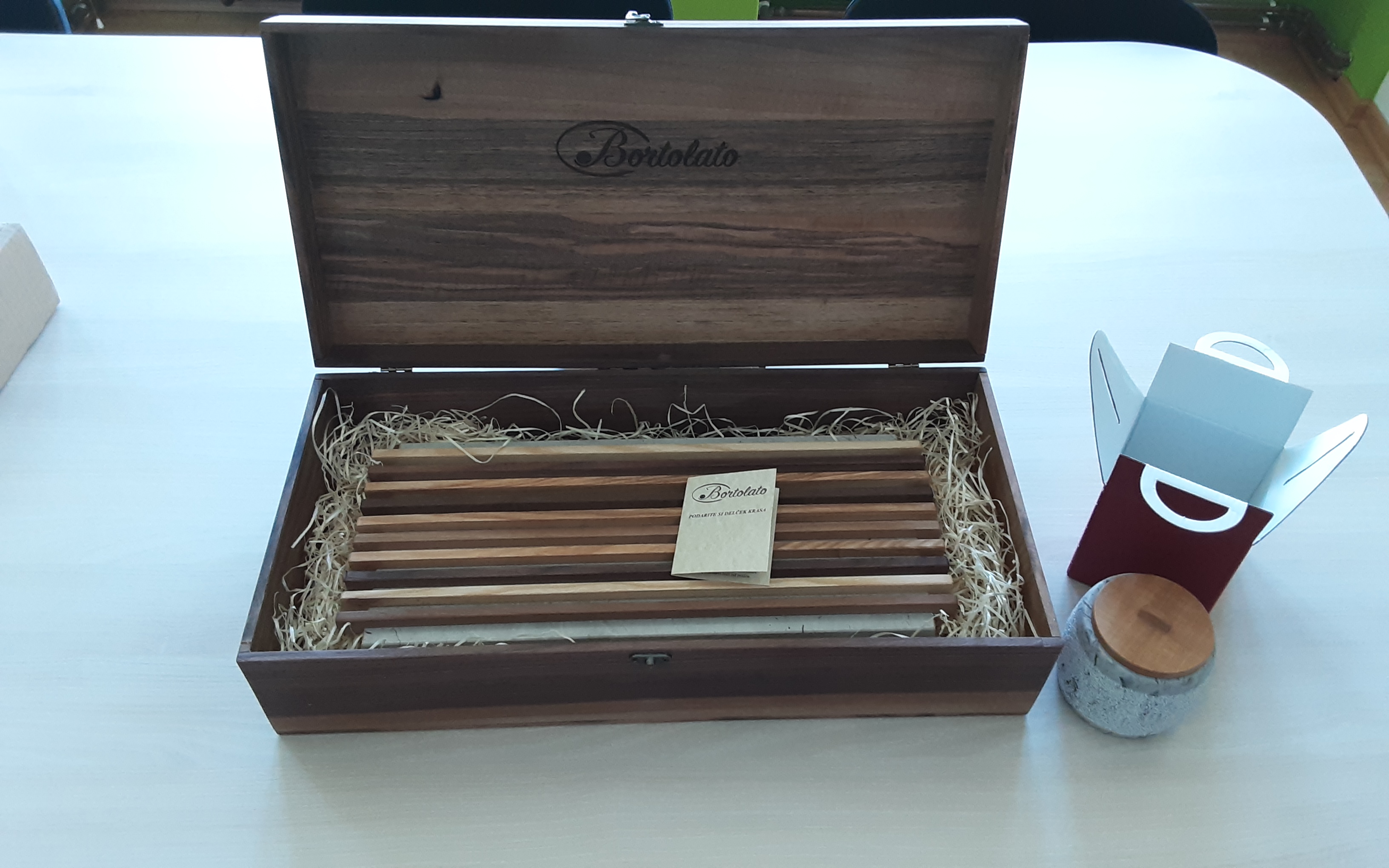 Bronasto priznanje pa je prejel kamnoseški mojster Jernej Bortolato in sicer za kombiniran pladenj iz kamna in lesa v leseni škatli iz orehovine in kamnito posodico. Pladenj je primeren za rezanja kruha in raznih pogač, kakršen je npr. kraški ˝presenc˝. (Foto)