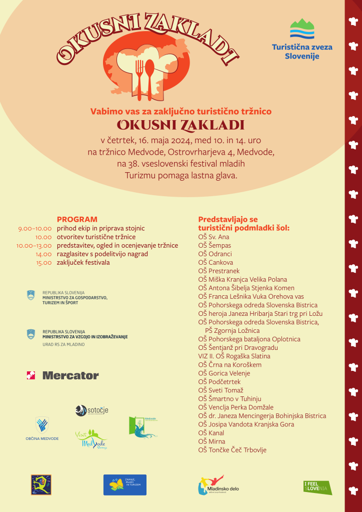 Turistična zveza Slovenije je skoraj do konca pripeljala že 38. festival Turizmu pomaga lastna glava. Mladi so se celo šolsko leto ukvarjali z idejami za nove kulinarične spominke, ki lahko pripomorejo k večji prepoznavnosti destinacije. Okusne in vabljive zaklade si lahko ogledate in jih poskusite 16. maja 2024 v športni dvorani v Medvodah, s pričetkom ob 10.00 uri.