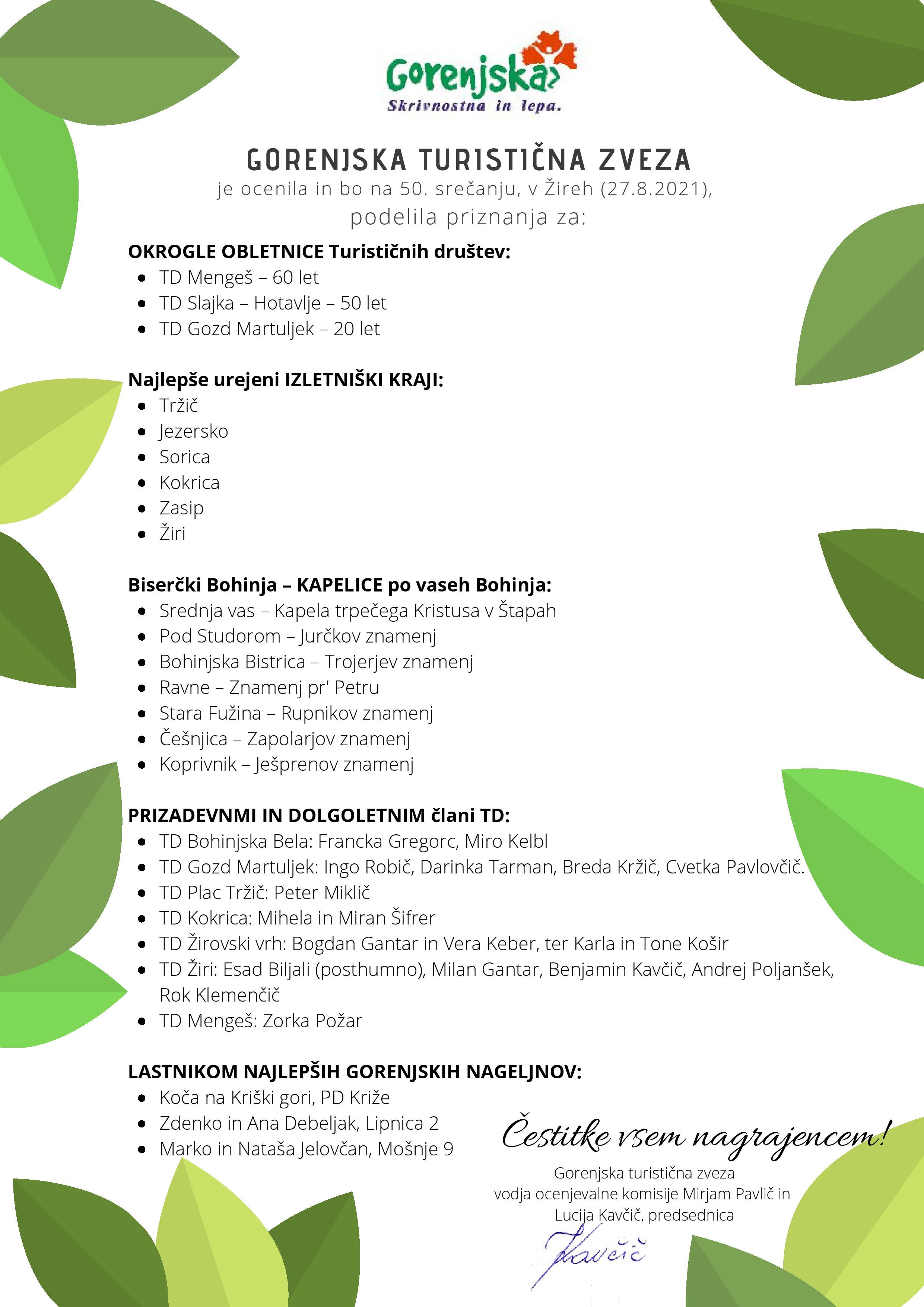 Osrednji del je predstavljala podelitev priznanj našim najprizadevnejšim članom ter tistim, ki veliko prispevajo k razvoju turizma in skrbijo za urejenost krajev. Priznanja so prejeli tudi trije najlepši gorenjski nageljni. Program je v šopek povezala Jana Jenko. Več o nagrajencih pa v nadaljevanju: