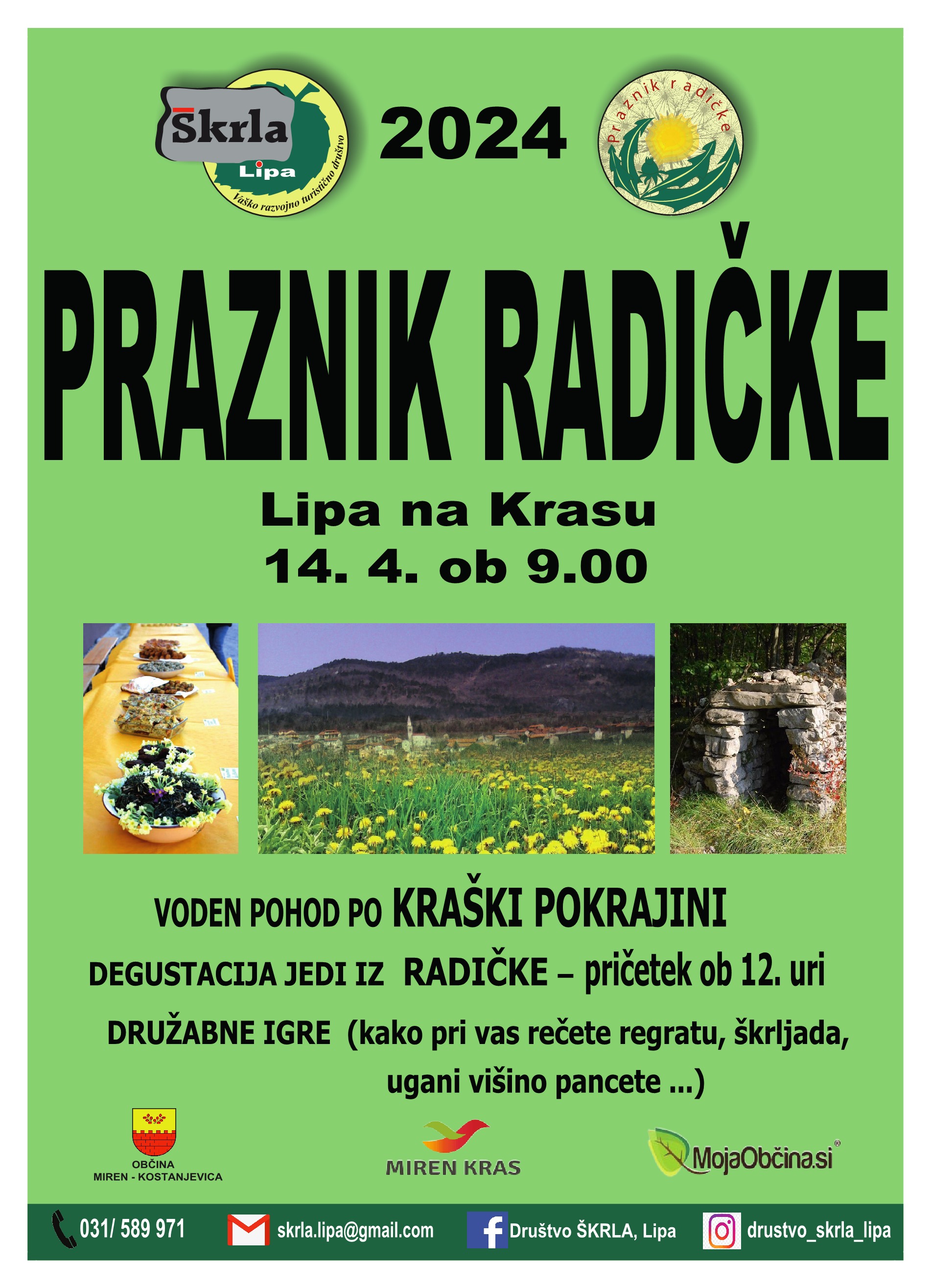 »Praznik radičke«, rekreativno - kulinarična prireditev, ki jo v Lipi na Krasu 14. 4. 2024, že šestič organizira Društvo Škrla. V Lipo ste na aprilsko nedeljo vabljeni ljubitelji narave in kulinarike. Tokrat bo voden pohod potekal po gmanji, južno od vasi, kjer si bomo ogledali kraške pojave, pastirske hiše, jame, kamnolom in še mnogo drugega.