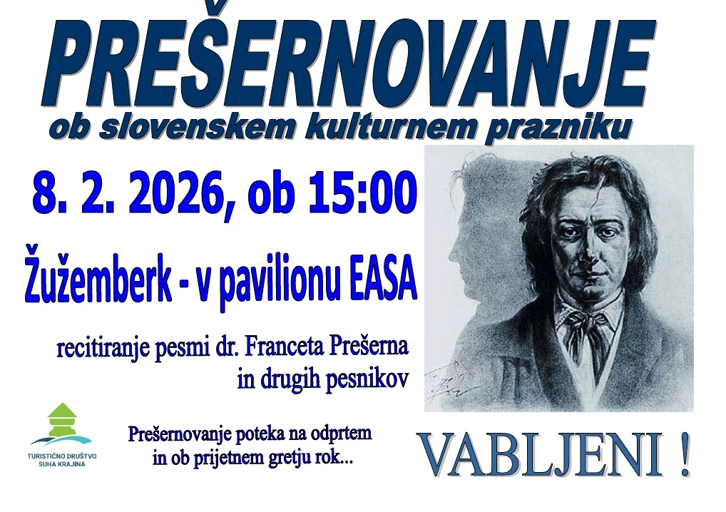 Turistično društvo Suha krajina vabi na že 14. tradicionalno Prešernovanje, s katerim bomo ob slovenskem kulturnem prazniku počastili življenje in delo našega največjega pesnika, dr. Franceta Prešerna. Prešernovanje bo pod pavilionom EASA v centru Žužemberka ob 15.00 uri. Pesmi bodo recitirali domači ustvarjalci, svoje verze pa bodo predstavili tudi domači in gostujoči pesniki,