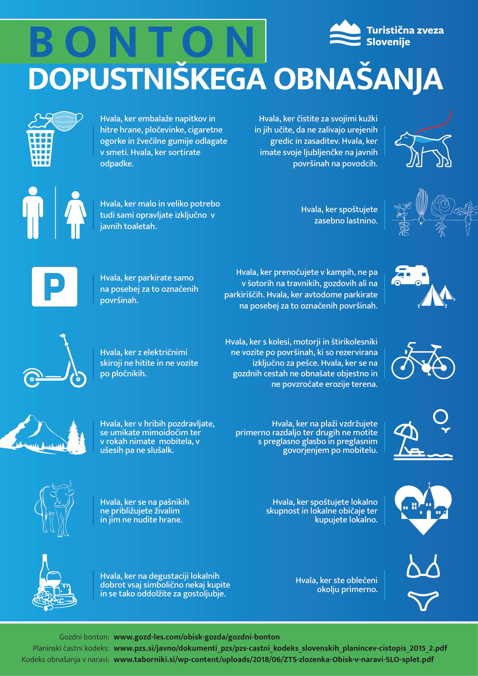 Pred poletno turistično sezono, ki jo bodo zagotovo ponovno zaznamovali domači gostje, smo tako sestavili bonton dopustniškega obnašanja, za katerega si želimo, da bi ga ponotranjili prav vsi slovenski dopustniki in izletniki.